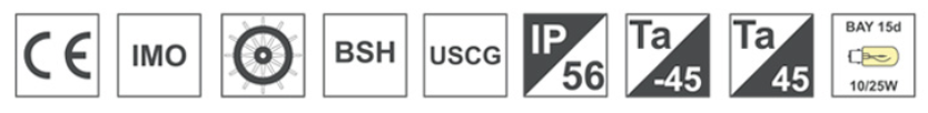 Housing Matte black or white polycarbonate, glass fibre reinforced, all components made from non-corrosive and nonmagnetic seawater resistant materials, Protection degree IP 56.