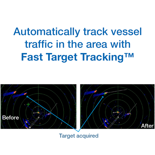 Fast Target Tracking™ instantly displays a vector indicating the target's speed and heading. Targets are automatically tracked, making it possible to immediately calculate and display a trajectory and velocity vector. Target vectors greatly increase situational awareness and overall safety on your vessel.