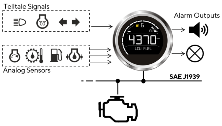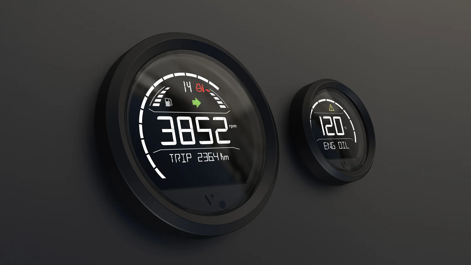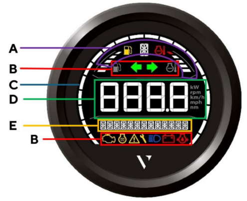 The VL Digital 85 has different telltales. Most are warning signs to alarm the customer about dangerous situations but there are also turn, preheat, and high beam indicators available.