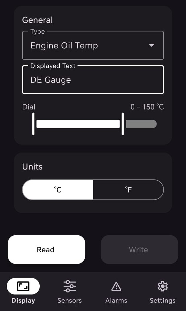 The text field at the bottom of the display lets the user know what type of measurement the shown value represents. English texts will be suggested as default. The configuration app allows this to be changed to other languages or completely customized texts.